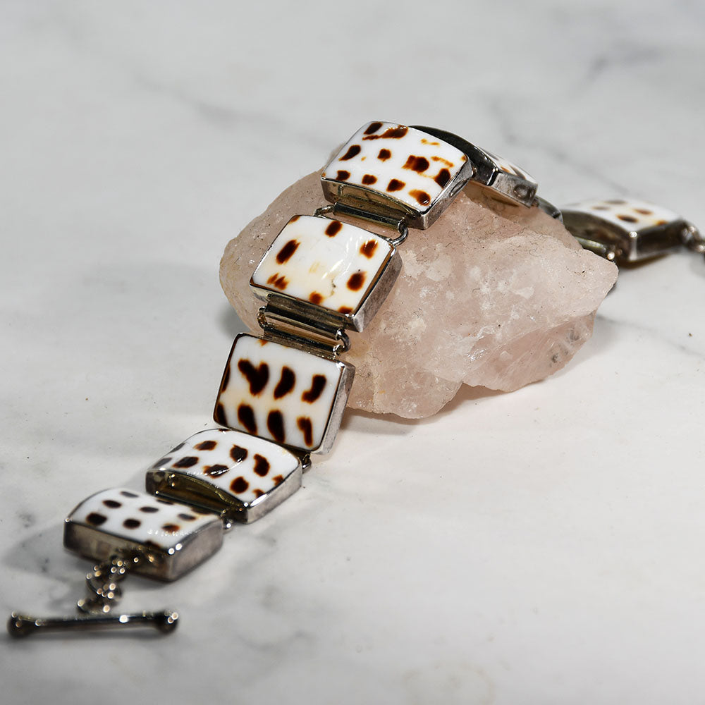 The 925 Square Silver casings of this multi-dimensional bracelet are enhanced by the random high contrast patterns of natural shell inserts