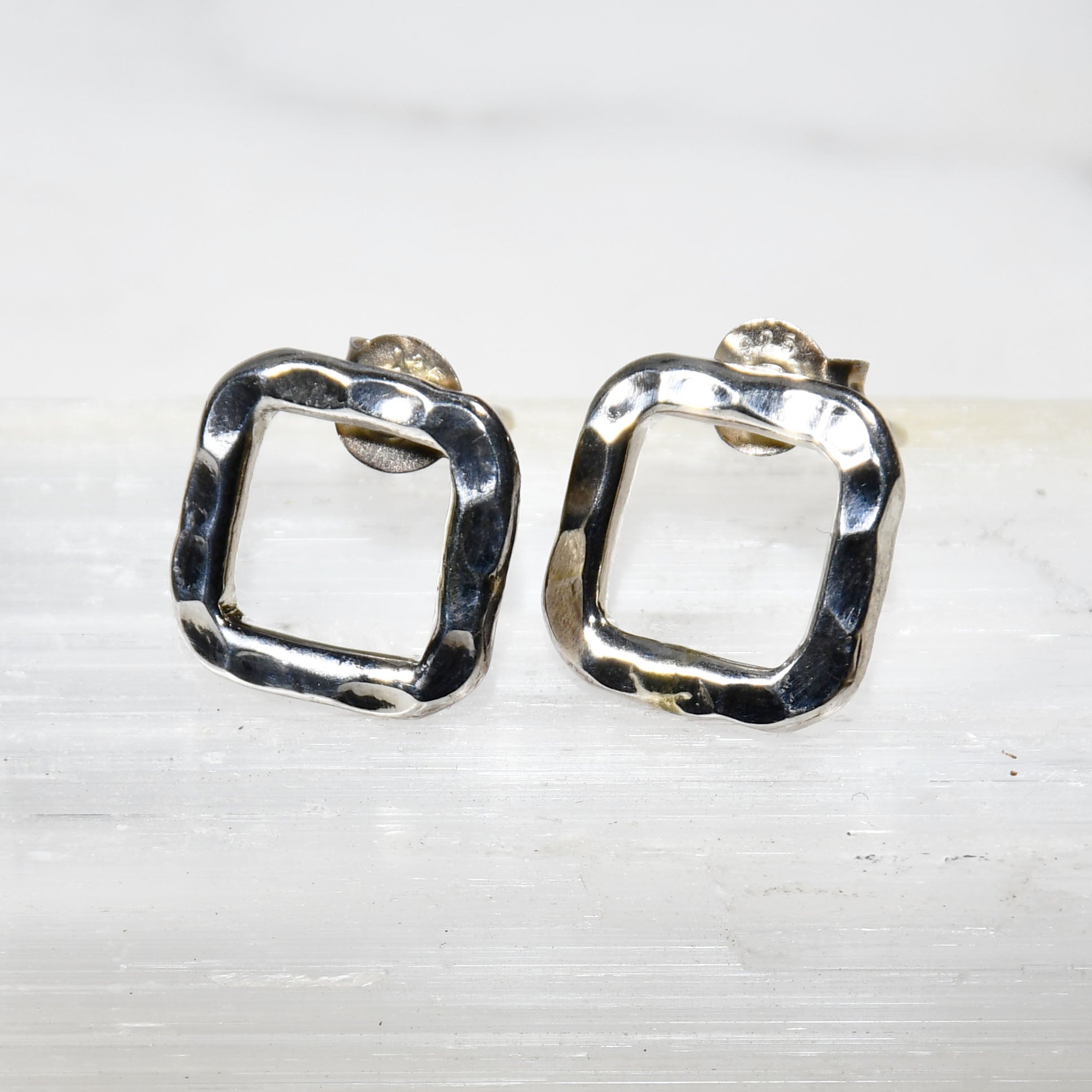 These small square sterling silver earrings with an open centre have a shiny textured surface